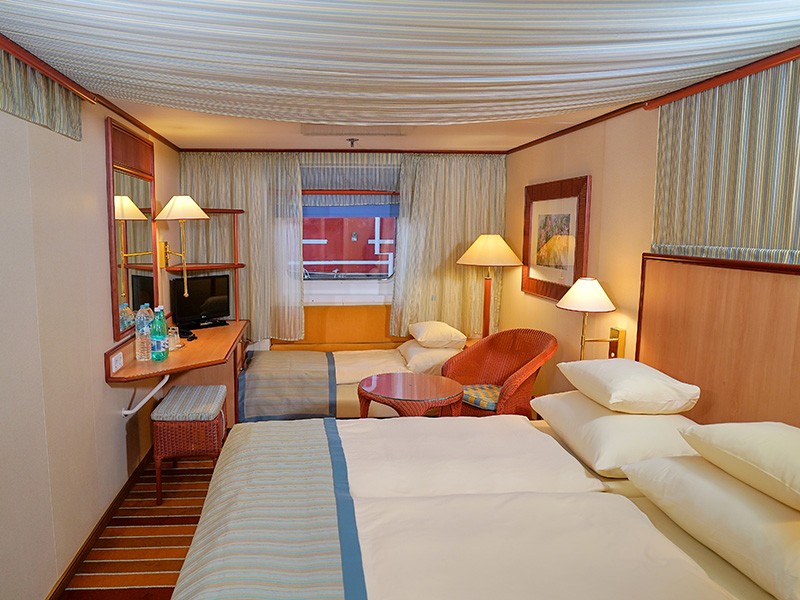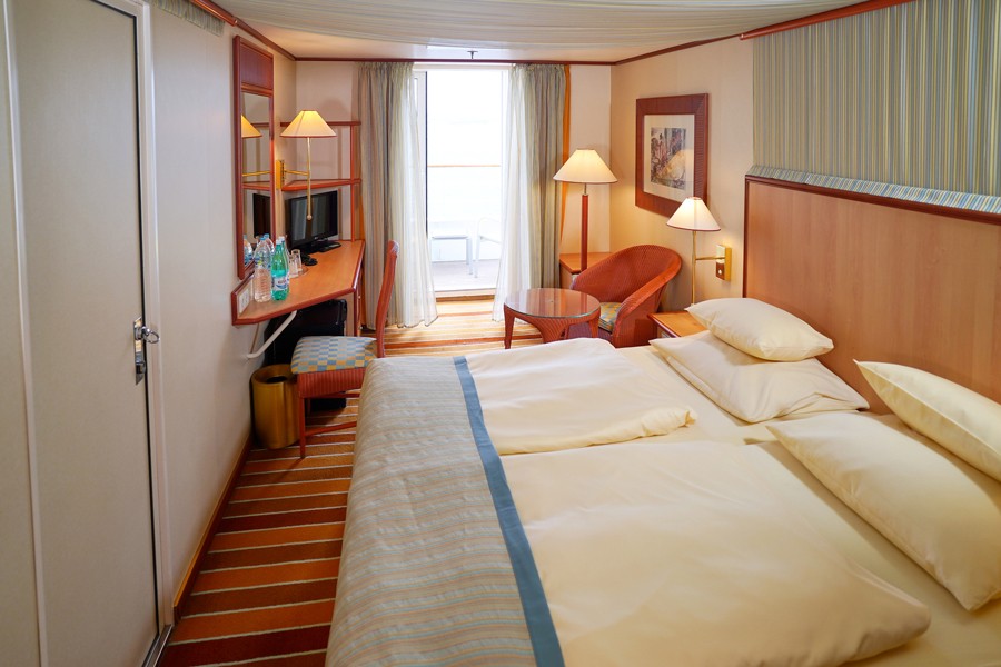 Двухместная каюта (площадь от 17 м² + балкон 3 м²) со всеми удобствами, расположенная на 7 палубе. Максимальная вместимость: 2 человека. В каюте: одна двуспальная кровать, балкон, холодильник, кондиционер, гардероб, телевизор, телефон, фен, сейф, халаты, увлажнитель воздуха, просторная ванная комната.