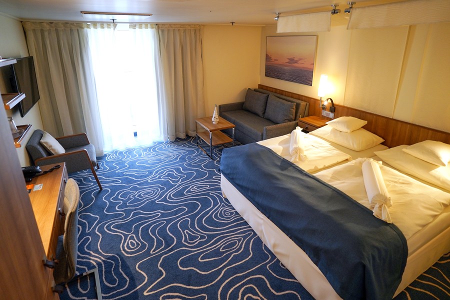 Двухместная каюта (площадь ≈16,8 м²) со всеми удобствами, расположенная на 4 и 5 палубах. Максимальная вместимость: 2 человека. В каюте: двуспальная кровать, панорамное окно, кондиционер, гардероб, телевизор, телефон, фен, сейф, халаты, увлажнитель воздуха, ванная комната с душем и туалетом.